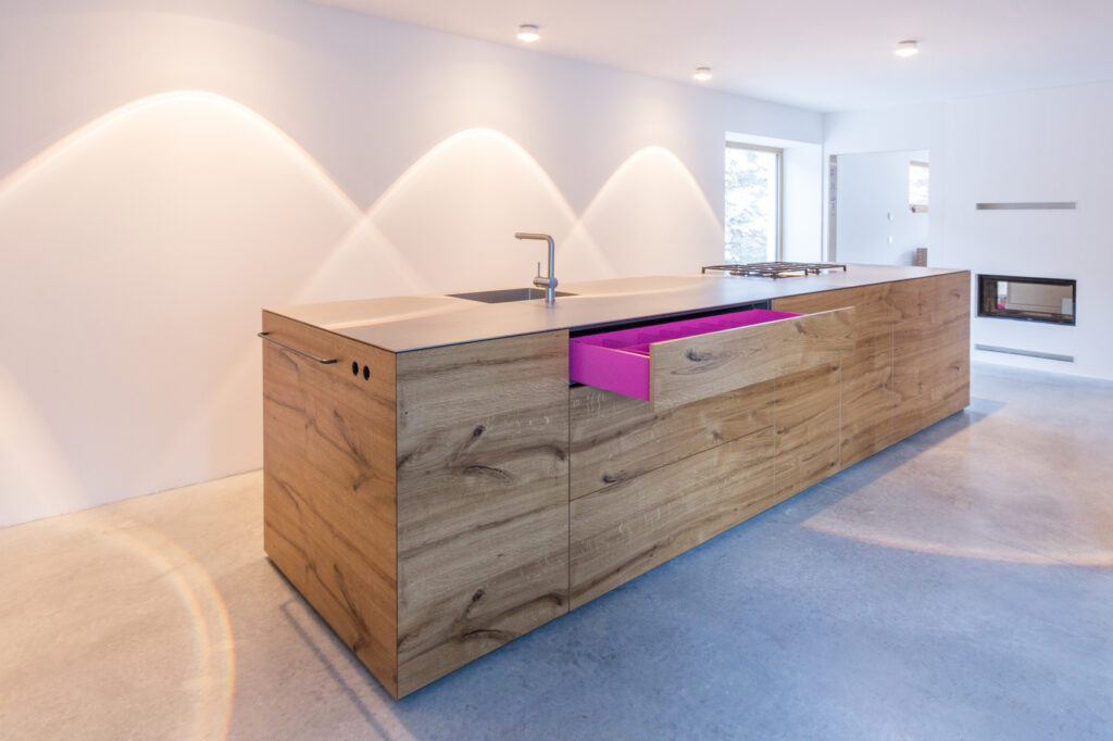 In diesem freistehenden Wohnhaus in Freising fühlt man sich der Natur verbunden. Der gesamte Innenausbau wurde von uns mit Liebe zum Detail erstellt. Geprägt wird dieser durch die Beleuchtung von Occhio, Materialien wie Zirbelkiefer und glatte, weiß lackierte Flächen als Kontrast.